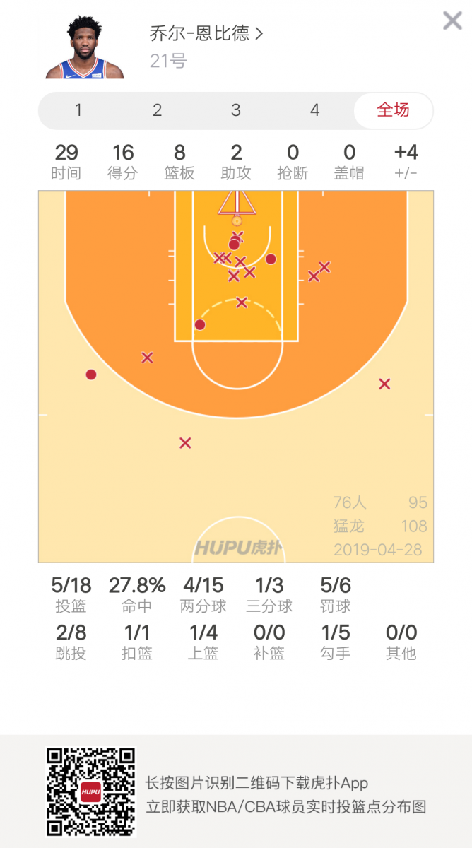 本场比赛,76人中锋乔尔-恩比德出场29分钟,18投5中得到16分8篮板2助攻。