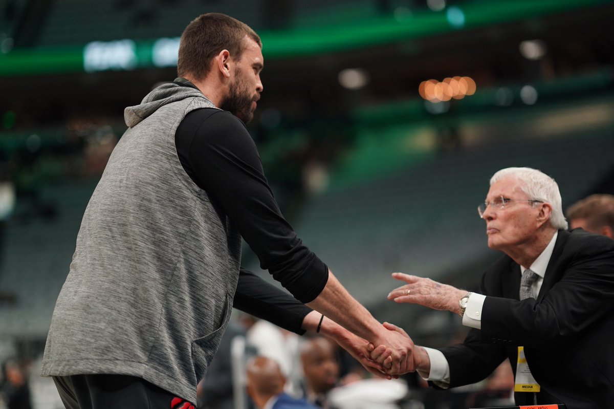 5月16日 猛龙今日在官方推特中晒出了两张球队成员马克-加索尔与86岁传奇解说胡比-布朗握手致意的照片。