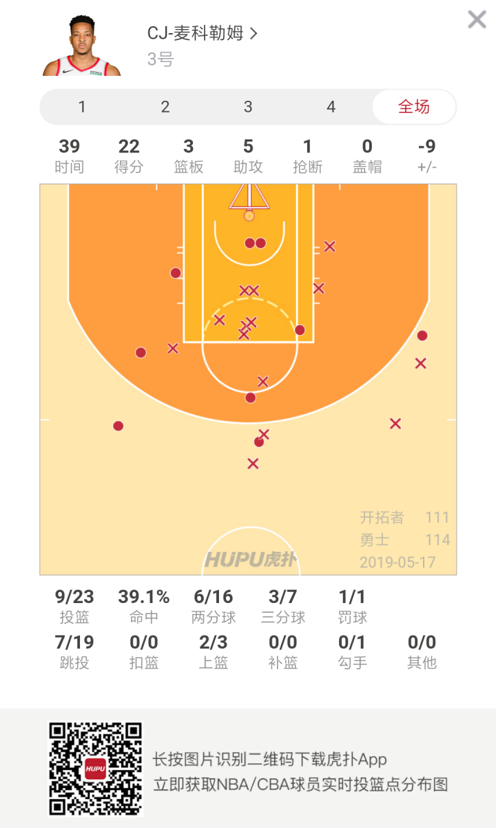 本场比赛,开拓者后卫CJ-麦科勒姆出场39分钟,23投9中,砍下22分3篮板5助攻1抢断。
