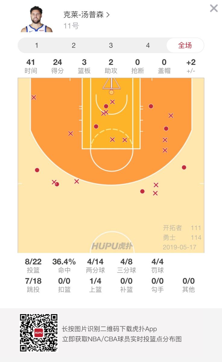 本场比赛勇士后卫克莱-汤普森发挥稳定,全场砍下24分3篮板2助攻。