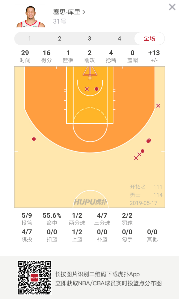 本场比赛,开拓者后卫塞思-库里出场29分钟,9投5中,高效砍下16分1篮板2助攻4抢断,其中三分球7投4中。