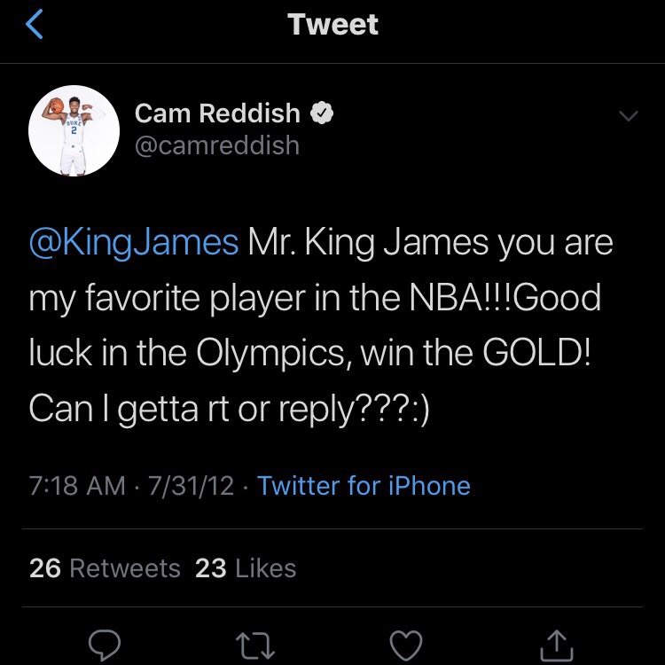 “@勒布朗-詹姆斯 国王詹姆斯先生,你是我最爱的NBA球员!!奥运会好运,拿下金牌吧!我能得到你的一次转发或点赞吗???”当时年仅12岁的雷迪什写道。