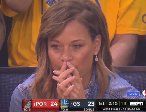 5月17日 勇士和开拓者的西部决赛G2正在进行中,第二节时ESPN记者对看台上的戴尔-库里进行了采访。
