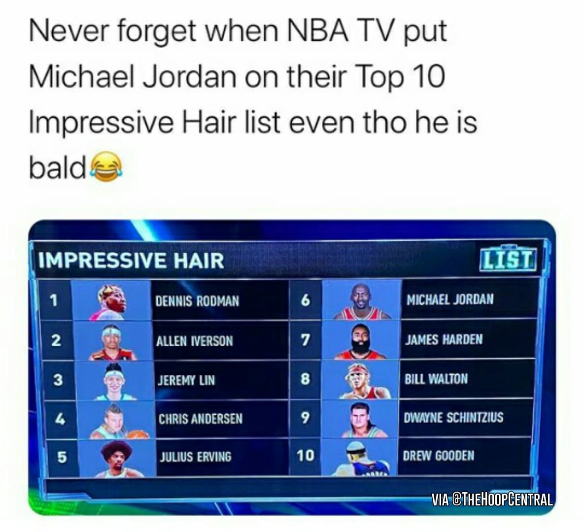 (永远不会忘了那次NBA TV把迈克尔-乔丹放到了最印象深刻发型Top 10,而他是光头)