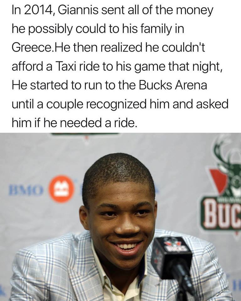 (2014年,字母哥把自己所有的钱都寄回了希腊的家里,然后他意识到自己没钱打的去比赛,他开始跑步去雄鹿场馆,直到一对情侣认出了他并问他需不需要搭便车)