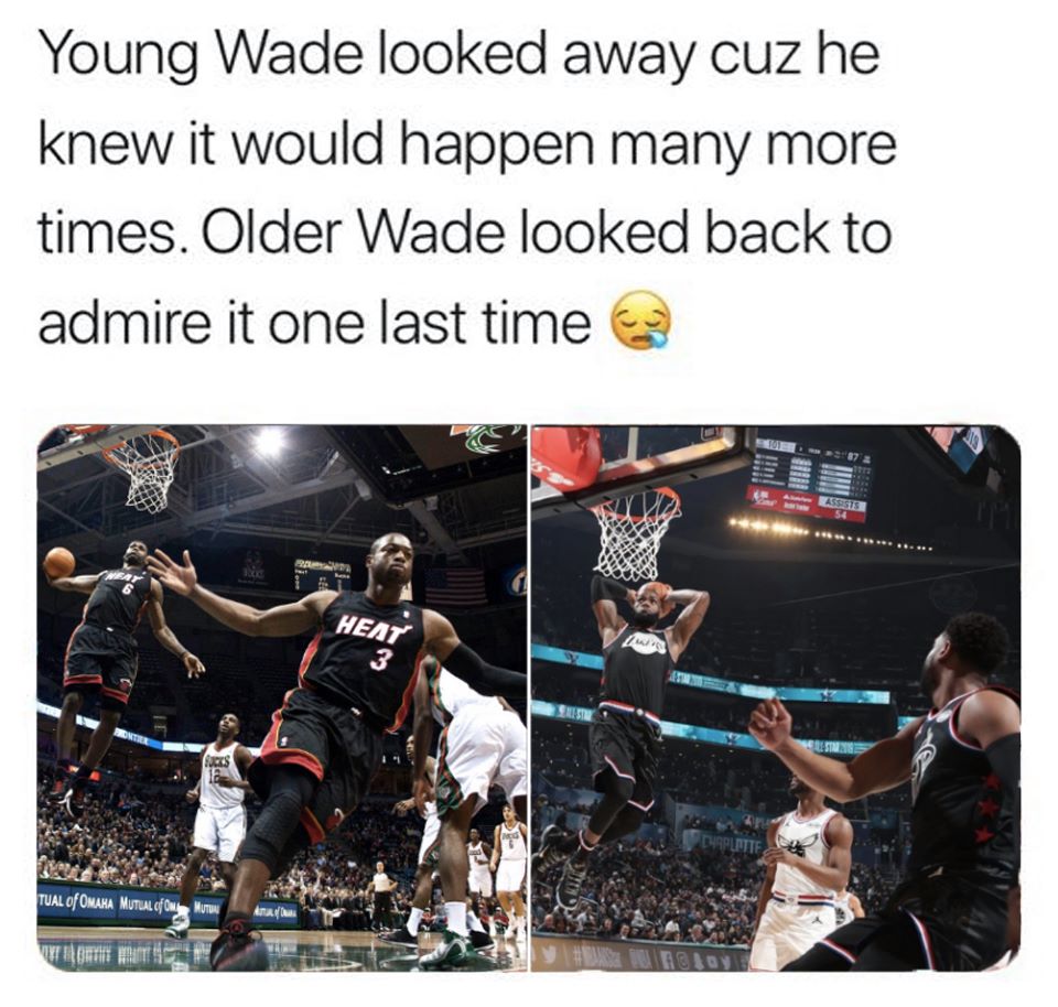 (年轻的韦德不会回头因为他知道这会经常发生。老韦德回头看了,为了欣赏最后一次詹韦连线)