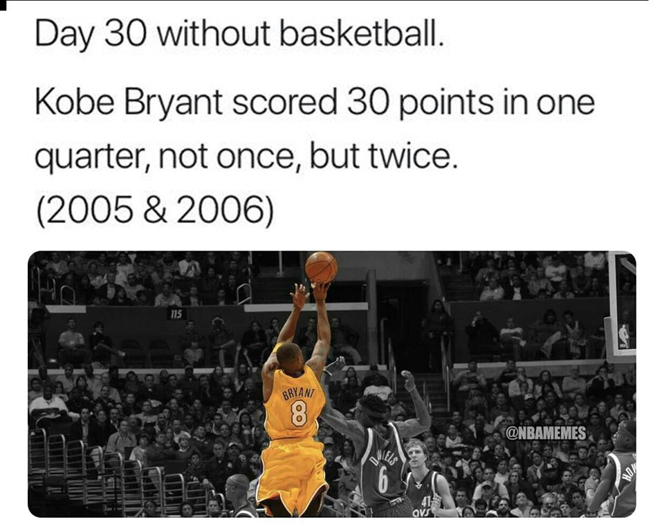 (没有篮球的第30天 科比单节得到过30分,不止一次,而是两次)