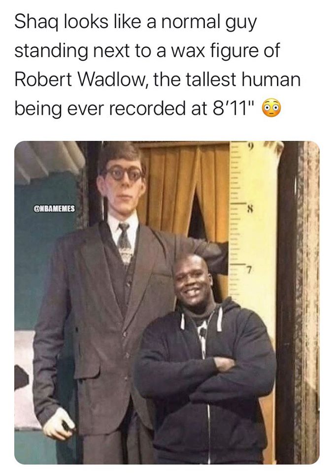 (奥尼尔站在罗伯特-瓦德洛的蜡像旁就像一个普通人,这个历史上最高的人长到了2.72米)