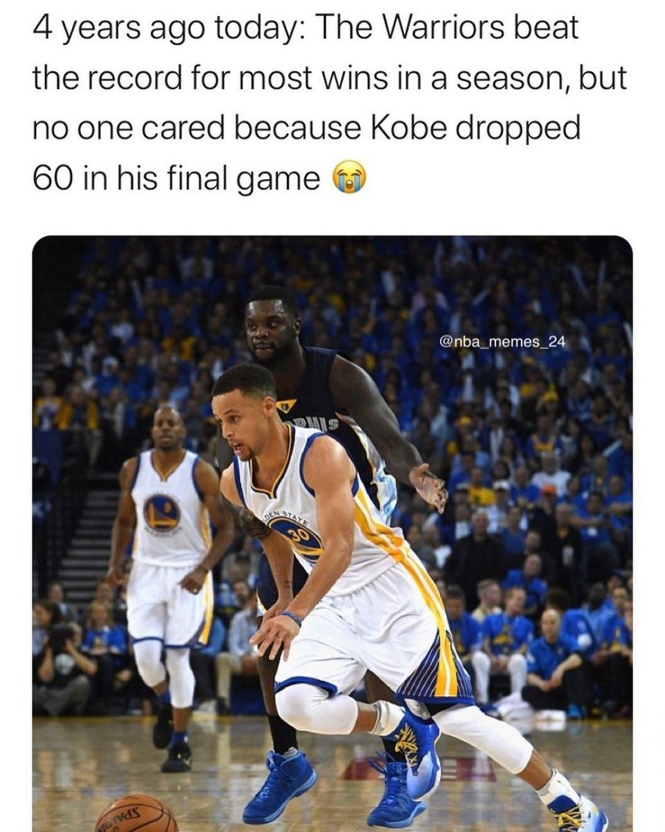 (4年前的今天:勇士创下了那个赛季的最多胜场记录,但是没人关心这个,因为科比在他最后一战中砍下了60分)