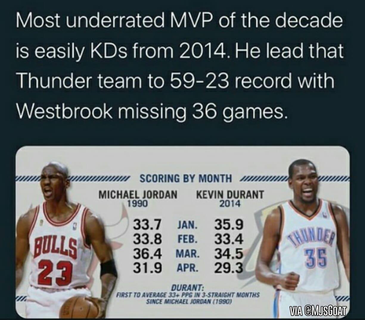 (近十年最被低估的MVP绝对是2014年的KD,他在威少缺席36场的情况下带领雷霆打出了59胜23负的记录)