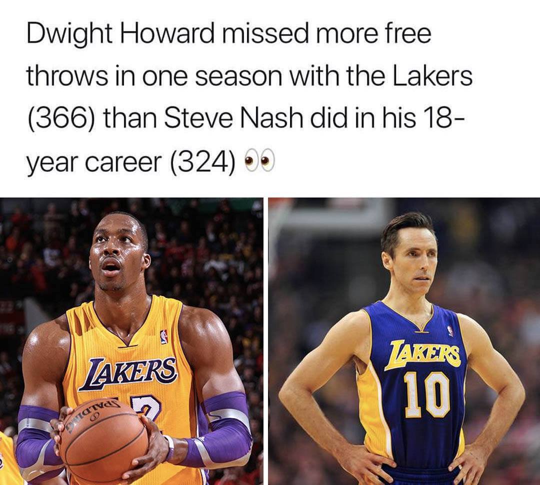 (德怀特-霍华德曾经在湖人一个赛季投丢的罚球(366)比史蒂夫-纳什整个职业生涯都多(324))