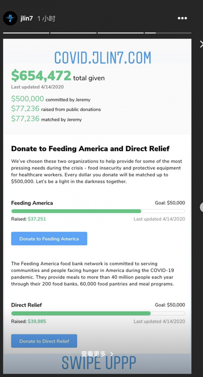 4月15日 今日,林书豪更新Instagram动态,晒出了目前的筹款进展。