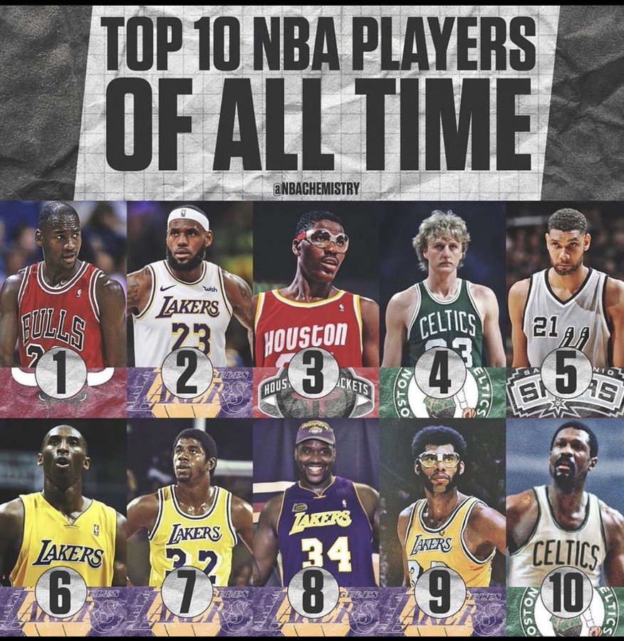 在这份名单中的TOP10依次为:1.迈克尔-乔丹;2.勒布朗-詹姆斯;3.哈基姆-奥拉朱旺;4.拉里-伯德;5.蒂姆-邓肯;6.科比-布莱恩特;7.魔术师约翰逊;8.沙奎尔-奥尼尔;9.卡里姆-阿卜杜尔-贾巴尔;10.比尔-拉塞尔。