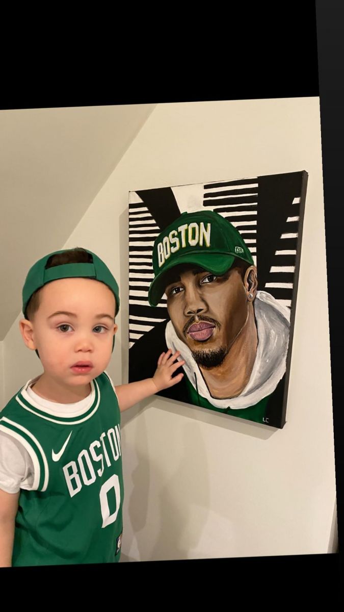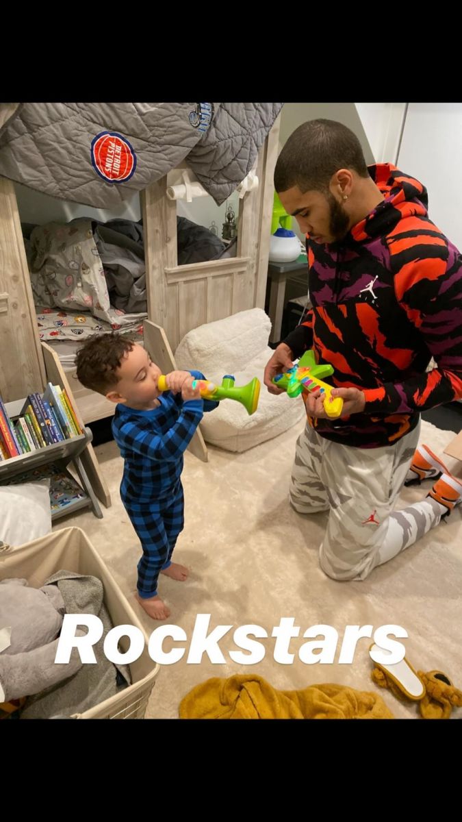 4月17日 今天,凯尔特人球员杰森-塔特姆在社交媒体上发布了自己陪儿子玩耍的图片,并写道:“摇滚巨星”。