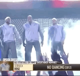勒布朗-詹姆斯、德怀特-霍华德、卡梅罗-安东尼和德维恩-韦德四位东部全明星首发球员跟随着入场音乐兴奋起舞,旁边的德里克-罗斯无动于衷一脸冷漠。