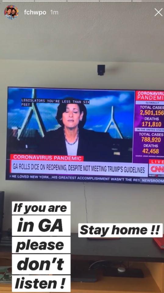 4月22日 凯尔特人前锋杰伦-布朗在个人Instagram上表示,希望身在佐治亚州的人们能够继续留在家里。