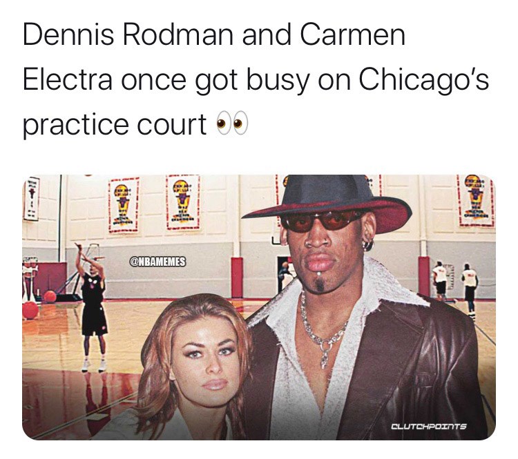 (罗德曼曾经和前女友Carmen Electra在公牛训练馆做过不可描述的事 注:相关新闻