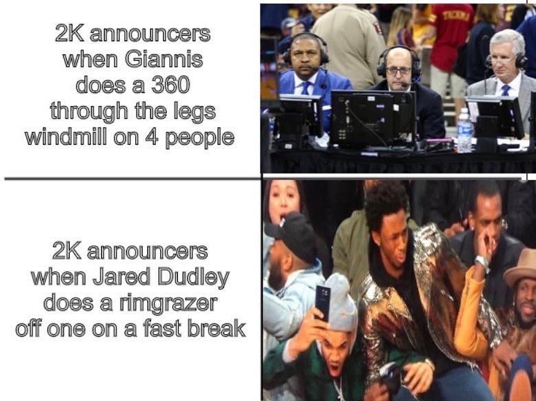 (上:当字母哥完成空中转体360度隔着4人胯下暴扣时的2k解说 下:当贾里德-杜德利在一次快攻中完成扣篮时的2k解说 )