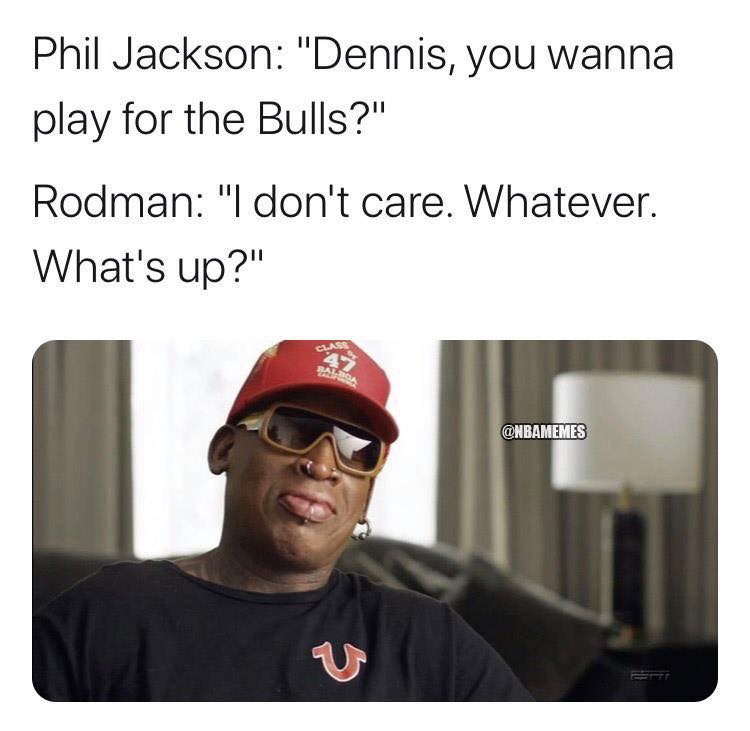(菲尔-杰克逊:“丹尼斯,你想为公牛打球吗?” 罗德曼:“额我不是很在乎,无所谓,有什么事吗?”)