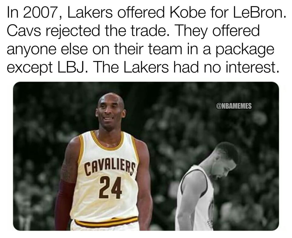 (2007年,湖人提出用科比交易勒布朗,骑士拒绝了。骑士提出球队里除了LBJ外的所有人都可以打包送出,而湖人也没有兴趣)