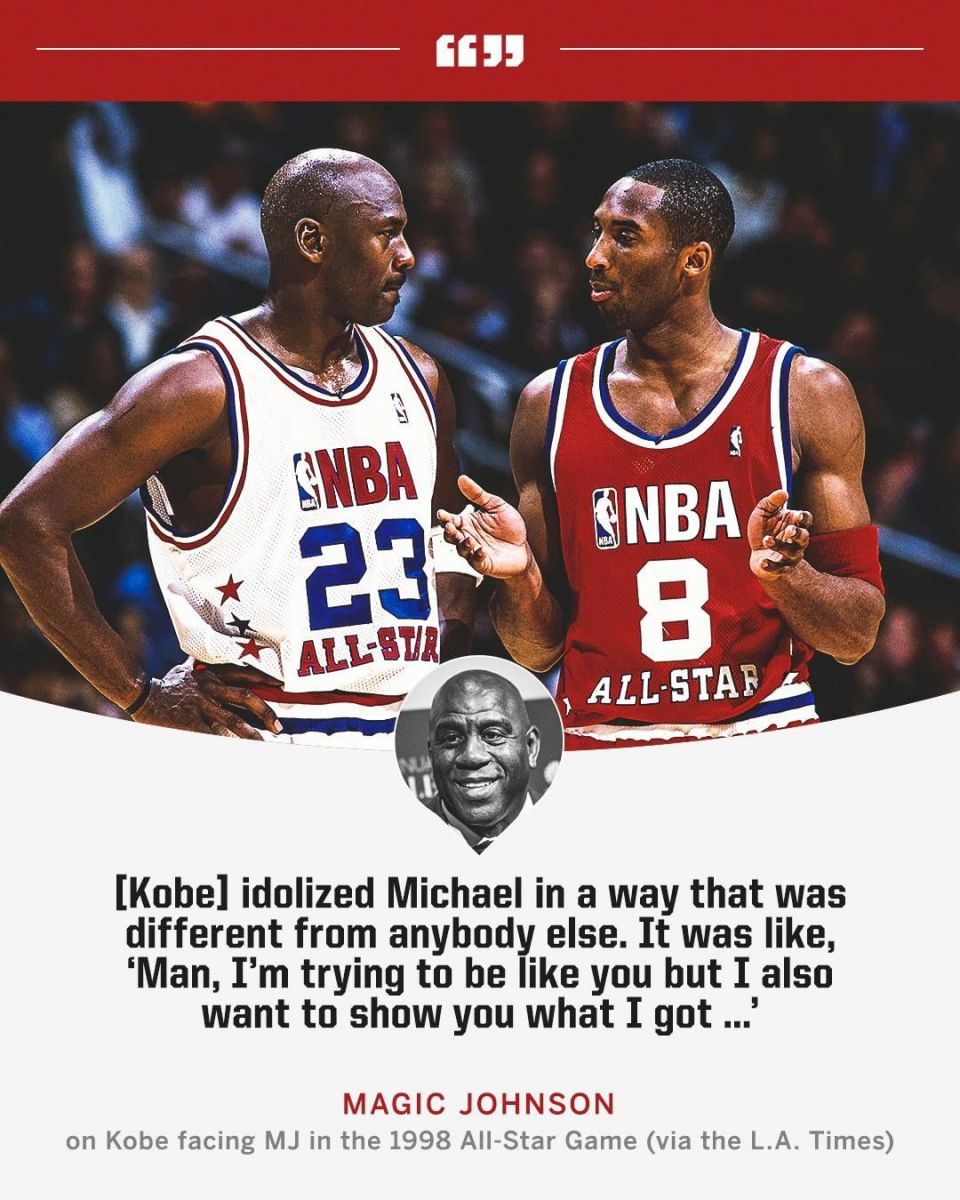 在谈及科比对乔丹的态度时,魔术师-约翰逊回忆了科比-布莱恩特与迈克尔-乔丹在1998年全明星赛场上相遇的场景,并说道:“虽然科比视乔丹为偶像,但他热爱乔丹的原因与所有人的都不一样。就好像是,'朋友,我正不断地努力去追上你的步伐,但我也想向你展示一下我的所知所学……’。”