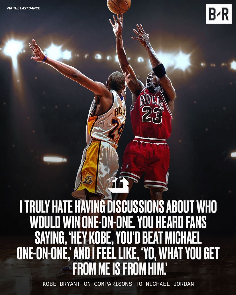 在谈及与迈克尔-乔丹的对比时,科比回应道:“说实话,我很讨厌这样的话题——讨论谁会在单挑中获胜。当你听见粉丝说:‘嗨,科比。你会在和乔丹的1V1中获胜。’时,我会觉得,'哟,你从我身上学到的其实都是来自于他。'"