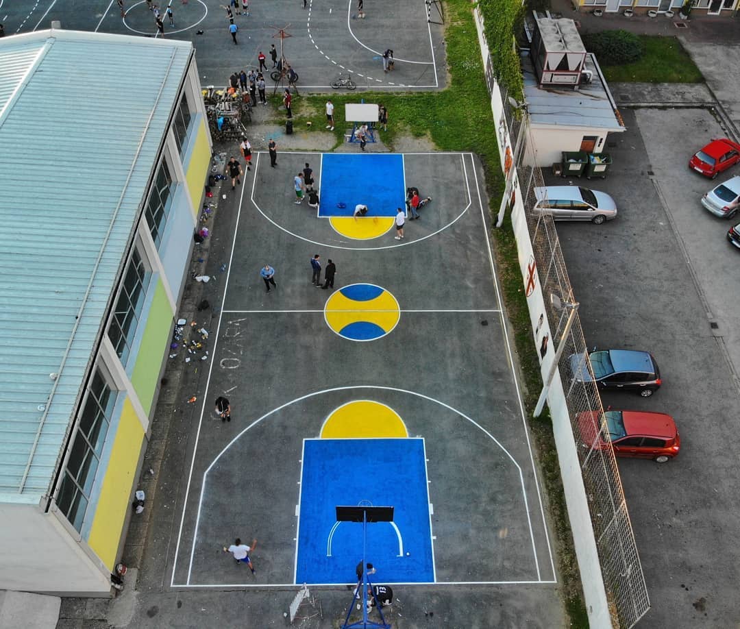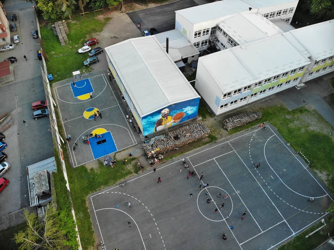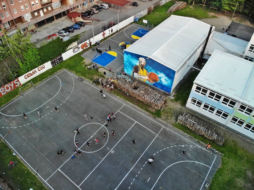 为纪念已故的湖人名宿科比-布莱恩特,意大利东北部格拉迪斯卡的一群年轻人自发创作了一幅长12米,宽6米的科比壁画,并布置了校园里的运动场。