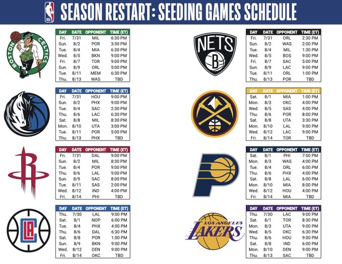 6月27日 NBA、球员工会、迪士尼敲定了复赛的具体赛程。