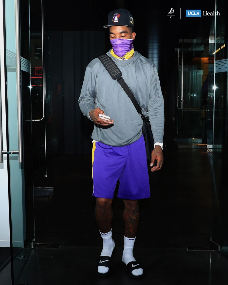 7月8日 湖人官方推特今日发布两张凯尔-库兹马和JR-史密斯的训练照,号召球迷佩戴口罩。