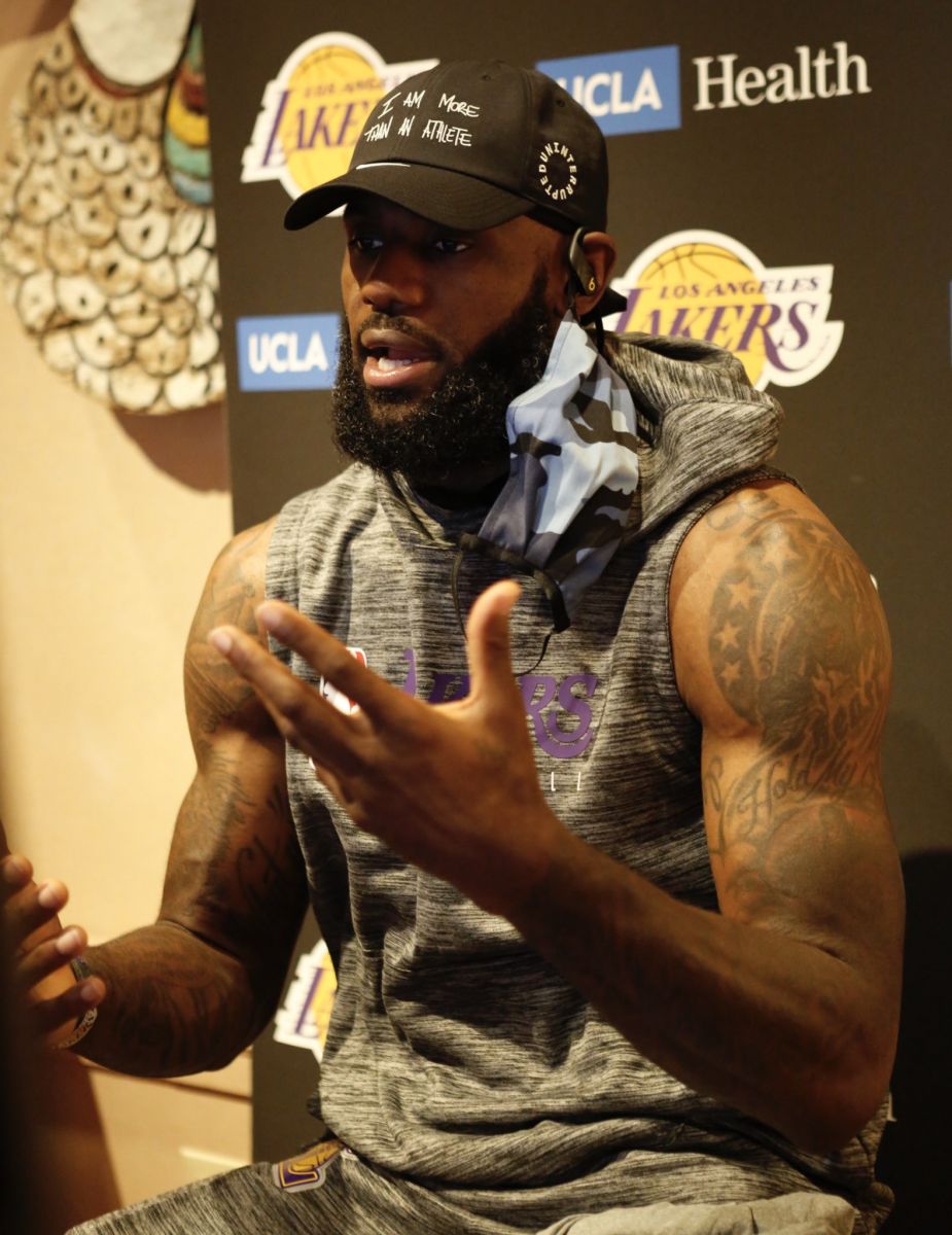 7月12日 NBA官方推特今日发布一组湖人前锋勒布朗-詹姆斯在训练之前远程接受媒体采访的现场照。