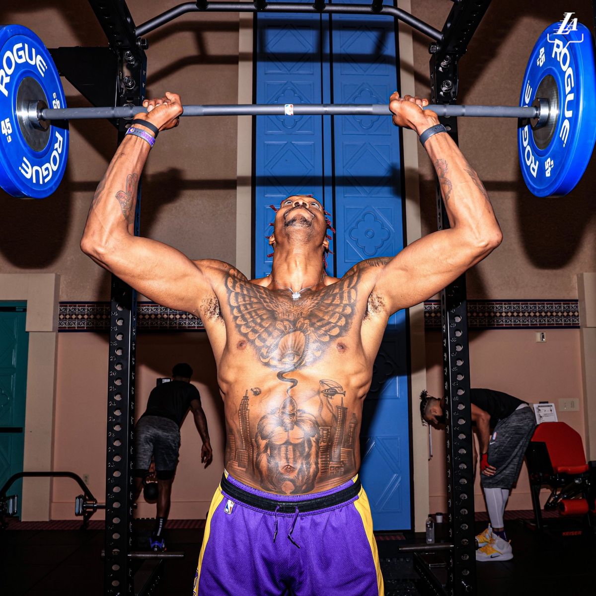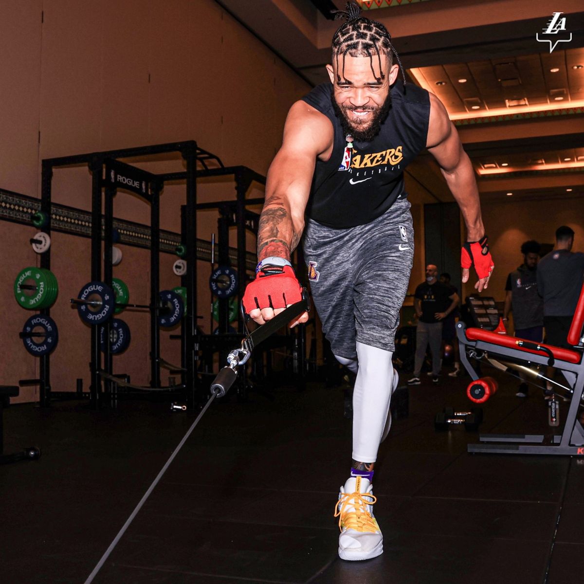 “带着目的去热身。”湖人官推写道。